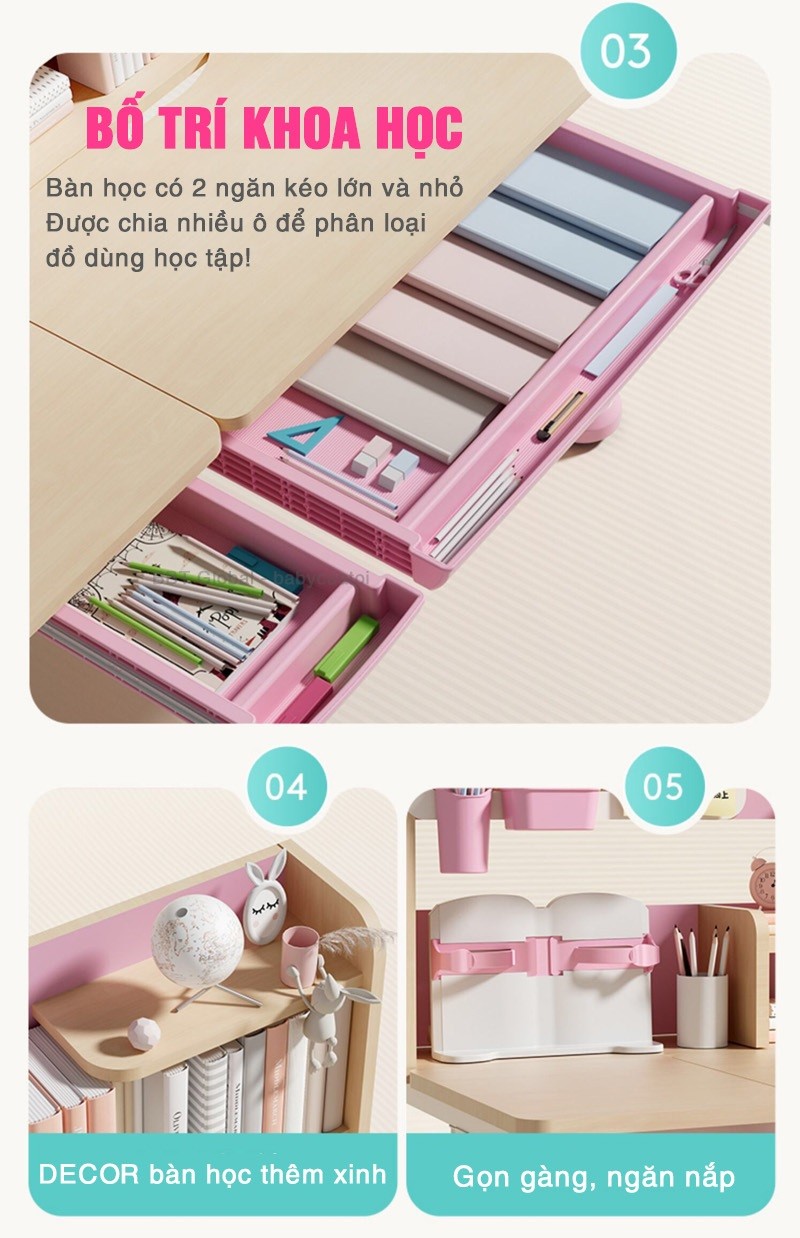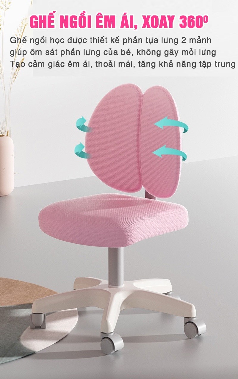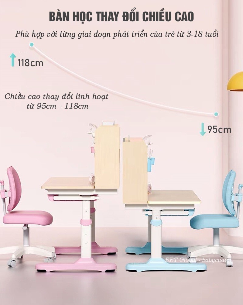 - Thương hiệu: BBT Global - Kích thước bàn: dài 110cm, rộng 59 cm, cao 95-118cm - Kích thước ghế ngồi: 35*35*70-82cm - Độ tuổi sử dụng: 3-18 tuổi - Bảo hành: 5 năm, 1 đổi 1 trong 100 ngày nếu có lỗi sản xuất - Màu sắc: hồng - Mặt bàn phủ Matte giúp tản sáng, chống lóa, chống xước, chống thấm nước và chống bám bẩn - Ghế ngồi cao cấp nâng đỡ cột sống, điều chỉnh kích thước theo 3 chiều, tự do thay đổi theo ý muốn - Ghế ngồi khóa trọng lực an toàn, bé chỉ cần ngồi lên ghế sẽ tự động khóa bánh xe tránh trơn trượt - Ghế ngồi thông minh chống gù, chống cận còn giúp trẻ thư giãn ngay cả khi học bài, giảm căng thẳng mệt mỏi, trẻ minh mẫn và tập trung học bài hiệu quả hơn.