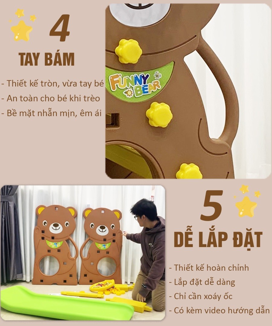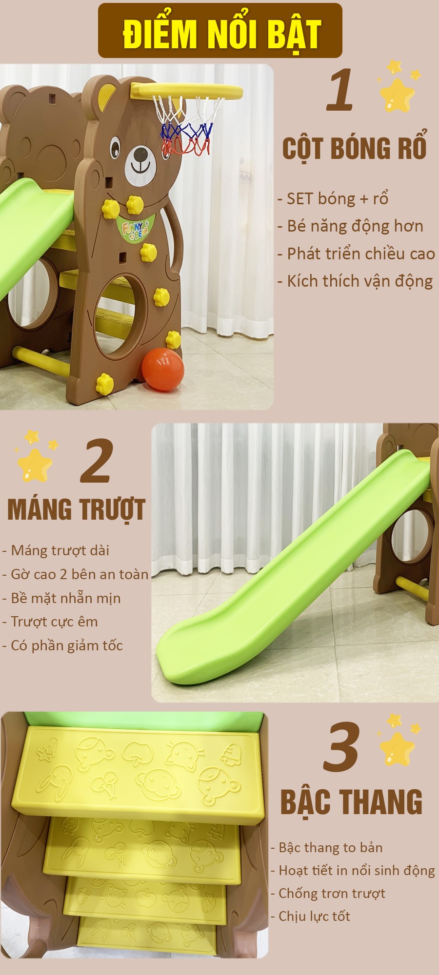 ✔ Xuất xứ: Hàn Quốc ✔ MADE IN KOREA nên độ tỉ mỉ cao, bề mặt nhẵn mịn, góc cạnh bo tròn ✔ Kích thước: Dài 161cm, Rộng 82cm, Cao 108 cm ✔ Dành cho bé từ 1.5 - 09 (tuổi) ✔ Cầu trượt thiết kế to và cao, tải trọng tới 60kg ✔ Thiết kế hình chú gấu TEDDY đáng yêu ✔ Đa năng 4 trong 1: Cầu trượt, Xích đu, Bóng rổ, Leo thang ✔ Có 2 lựa chọn: Trắng máng thẳng hoặc Nâu máng lượn ✔ Máng trượt to bản, gờ cao 2 bên, thay đổi được 3 mức độ cao (chỉ dòng cầu trượt cao cấp mới có) ✔ 4 bậc thang lớn bản vuông chữ nhật chắc chắn, chống trơn trượt ✔ Chất liệu: Nhựa nguyên sinh cao cấp bền đẹp, an toàn cho bé ✔ TẶNG SET BÓNG RỔ giúp bé phát triển chiều cao tối ưu ✔ Hàng nhập khẩu tiêu chuẩn châu Âu - CE ✔ Bảo hành 24 tháng, hỗ trợ phụ kiện trọn đời sản phẩm ✔ Lỗi 1 đổi1 trong vòng 30 ngày nếu có lỗi NSX ✔ Cầu trượt trẻ em cao cấp, vượt qua tất cả các tiêu chuẩn chất lượng an toàn cho bé tại Hàn Quốc ✔ Khối lượng nhựa để đúc ra chiếc cầu trượt Hàn Quốc sẽ lớn hơn rất nhiều so với cầu trượt TQ nên cực kỳ chắc chắn, không những phù hợp lắp tại gia đình mà còn được đặt ở trường mầm non, khu vui chơi lớn... ✔ Dễ dàng lắp đặt, tháo ra dễ dàng vì các chi tiết được đúc nguyên khối (có video hướng dẫn lắp đặt phía dưới website)