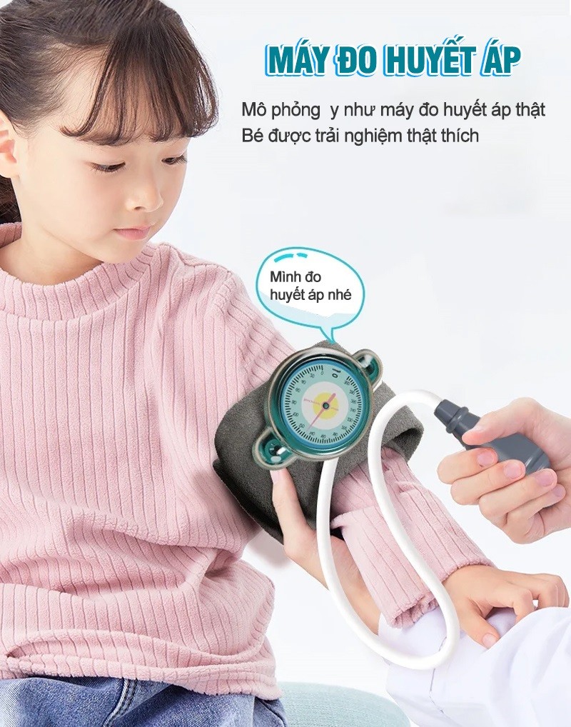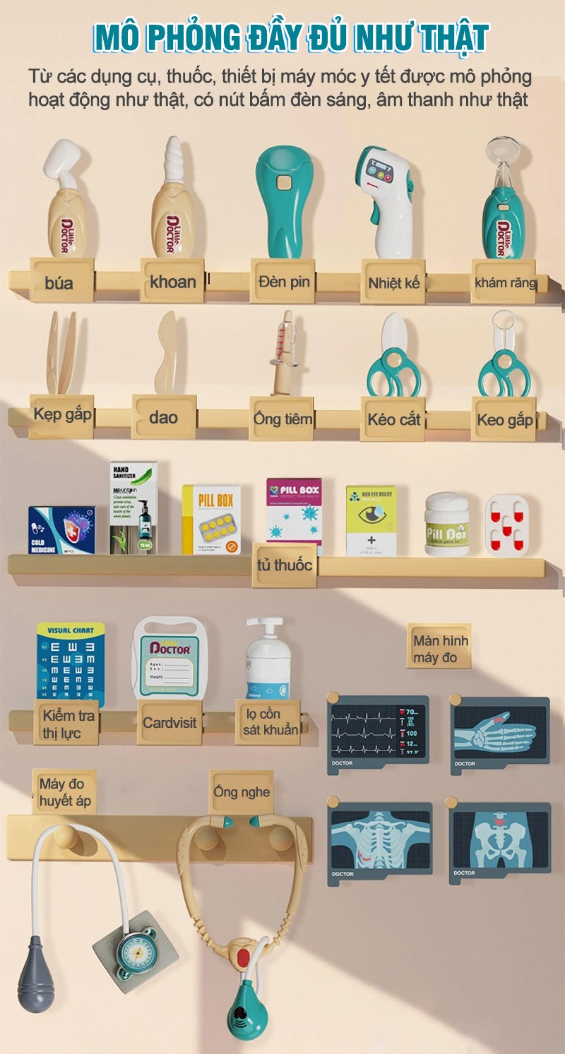 - Bé được khám phá các dụng cụ y tế và cách sử dụng từng món đồ: tăng khả năng quan sát và ghi nhớ, bé thông minh hơn