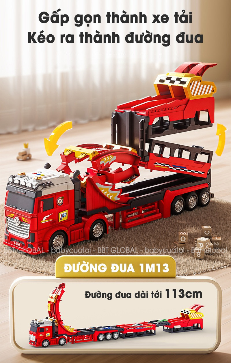Đồ chơi xe tải biến hình đường đua 1m13 kèm xe hợp kim có đèn và nhạc JP588-32