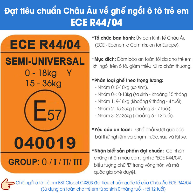 Ghế ô tô cho bé BBT GLOBAL Đạt chứng nhận ECE R44/04 - viết tắt của Regulation No 44 of the Economic Commission for Europe (Quy định số 44 về các tiêu chuẩn an toàn đối với ghế ô tô được ban hành bởi Ủy Ban Kinh tế Châu Âu) và 04 (hiện là phiên bản mới nhất của ECE R44 và có hiệu lực từ tháng 6 năm 2005) hoặc 03, 2 phiên bản cũ: R44/01 và 02 đã còn không hợp pháp và không được bán hoặc sử dụng.