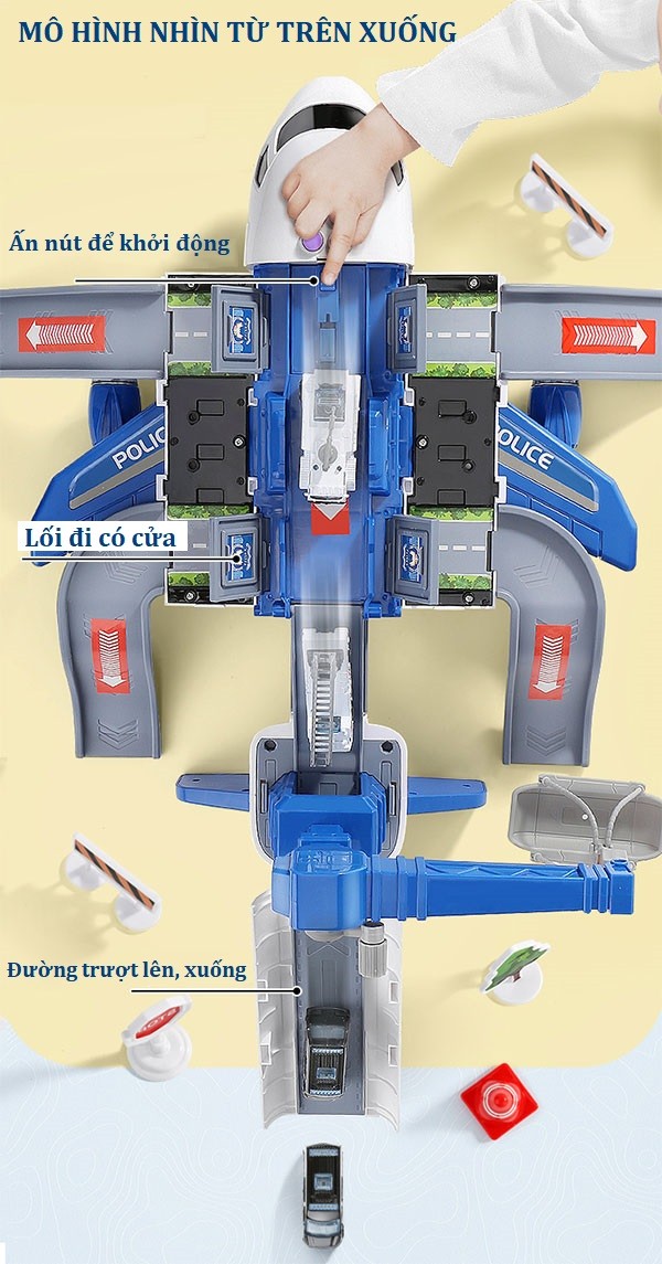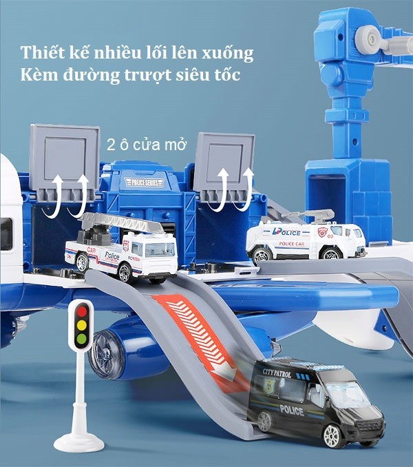 - Bao gồm: máy bay Police (Cảnh Sát) cỡ lớn, 4 xe ô tô cảnh sát, các loại biển báo giao thông, có giàn cẩn cẩu nâng có trục xoay được 360 độ, có nhiều đường trượt lên xuống cho các phương tiện