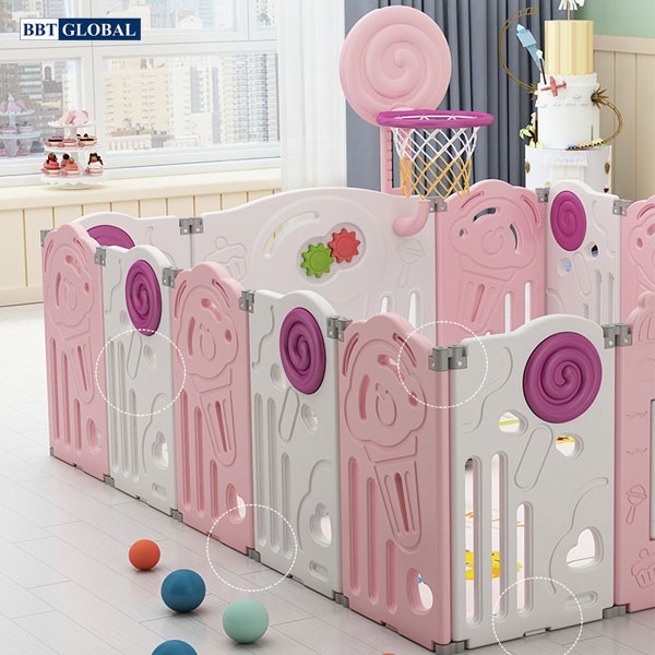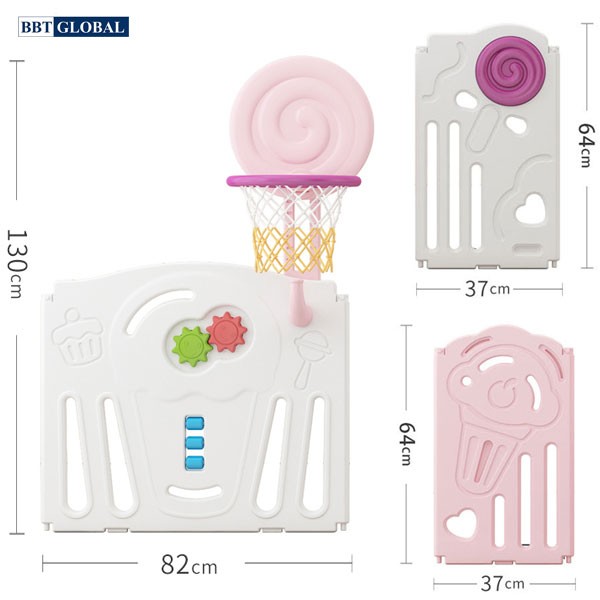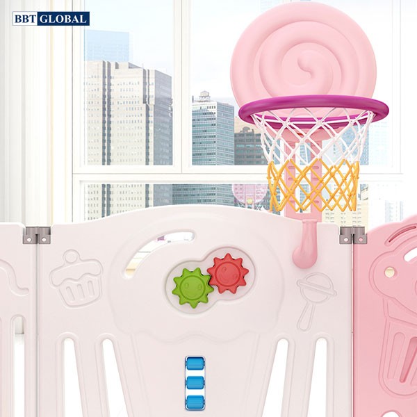 Quây bóng còn được tích hợp thêm cạnh đồ chơi, ném bóng rổ hình kẹo xoắn cho bé rèn luyện sự tinh mắt, nhanh tay và khéo léo