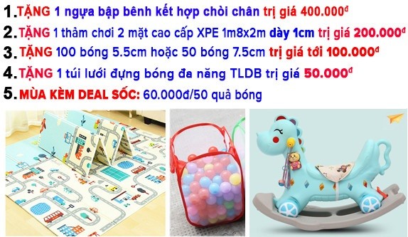 - Bộ combo bao gồm 10 món 11 chức năng: - 01 cầu trượt lâu đài lớn máng dài kích thước 180*65*98cm có gờ 2 bên và bậc thang kín chống lọt chân , 01 quây bóng gấp gọn Kích thước 180*200*62cm, 01 xích đu có kèm bàn ăn dặm, 01 bộ đồ chơi ném vòng, 01 bộ cột ném bóng rổ và bóng rổ, 01 thảm XPE cao cấp 1.8*2m dày 1cm, 100 bóng 5.5 cm hoặc 50 bóng 7.5cm, 01 giỏ đựng bóng đa năng, 1 bập bênh 2 chức năng có nhạc (mã RK524/RK-511)