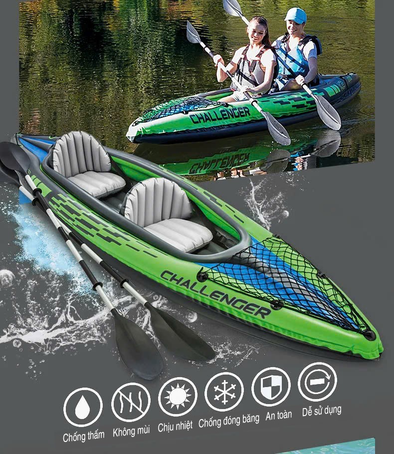Điểm nổi bật | - Thiết kế 2 khoang hơi riêng biệt, an toàn - 2 Ghế hơi tựa lưng cao cấp, sàn bơm hơi êm ái - Tích hợp khoang đựng đồ 2 đầu thuyền và có lưới đựng đồ phía trên - Mái chèo dài loại 2 đầu, chuyên dụng trong chèo thuyền - Tích hợp vây cá dưới đáy thuyền, tránh bị va đập dưới đáy |