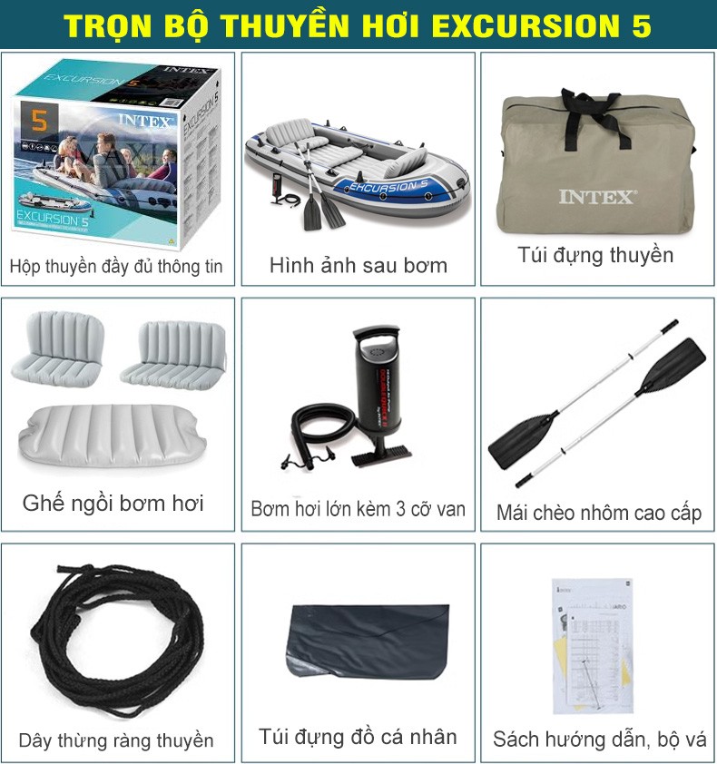 - Phụ kiện đi kèm: 1 thân thuyền, 2 mái chèo, 2 ghế ngồi hơi, 1 dây thừng, 1 túi đựng phụ kiện, 1 bơm tay, 1 bộ bảo hành INTEX.