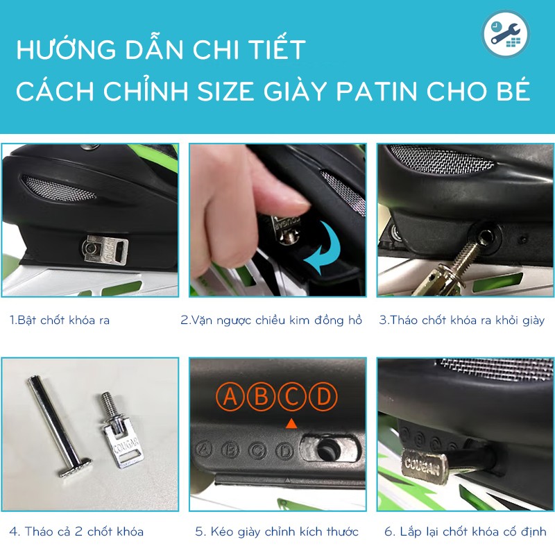 Giày có đủ 3 loại kích cỡ phù hợp với kích cỡ bàn chân của mỗi trẻ, từ 3 tuổi trở lên là đã có thể sử dụng sản phẩm. Tuy nhiên, phụ huynh lo lắng việc trẻ lớn lên theo từng ngày có thể khiến cho sản phẩm có thể nhanh chóng không vừa và phụ huynh lại tốn thêm một khoản chi phí khi mua sản phẩm mới. Việc sử dụng giày trượt patin Cougar pro tiết kiệm chi phí cho các vị phụ huynh rất nhiều, không còn nỗi lo tốn kém bởi trên thân giày có nút điều chỉnh kích cỡ giày tự động. Cha mẹ chỉ cần nhấn nút và kéo mũi giày về phía trước là đã có thể điều chỉnh được kích cỡ phù hợp với bé, thậm chí có thể tăng thêm từ 3 đến 5 size, như vậy với mỗi đôi giày Cougar pro bé có thể đi được đến tối đa 5 năm sử dụng.