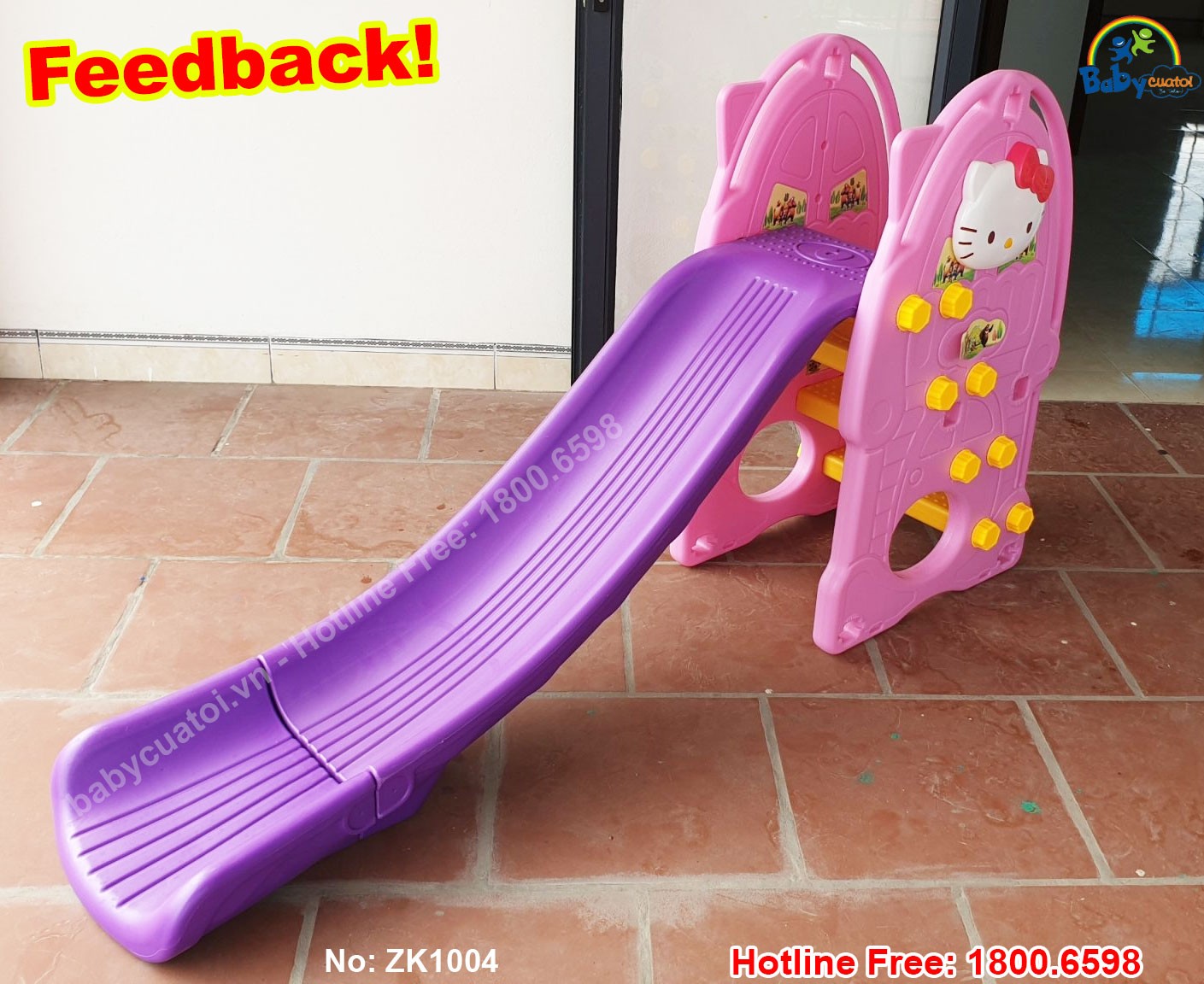 Cầu trượt có màu chủ đạo là màu hồng, máng tím, hoạ tiết trang trí hello kitty cực kỳ dễ thương dành cho các bé gái.