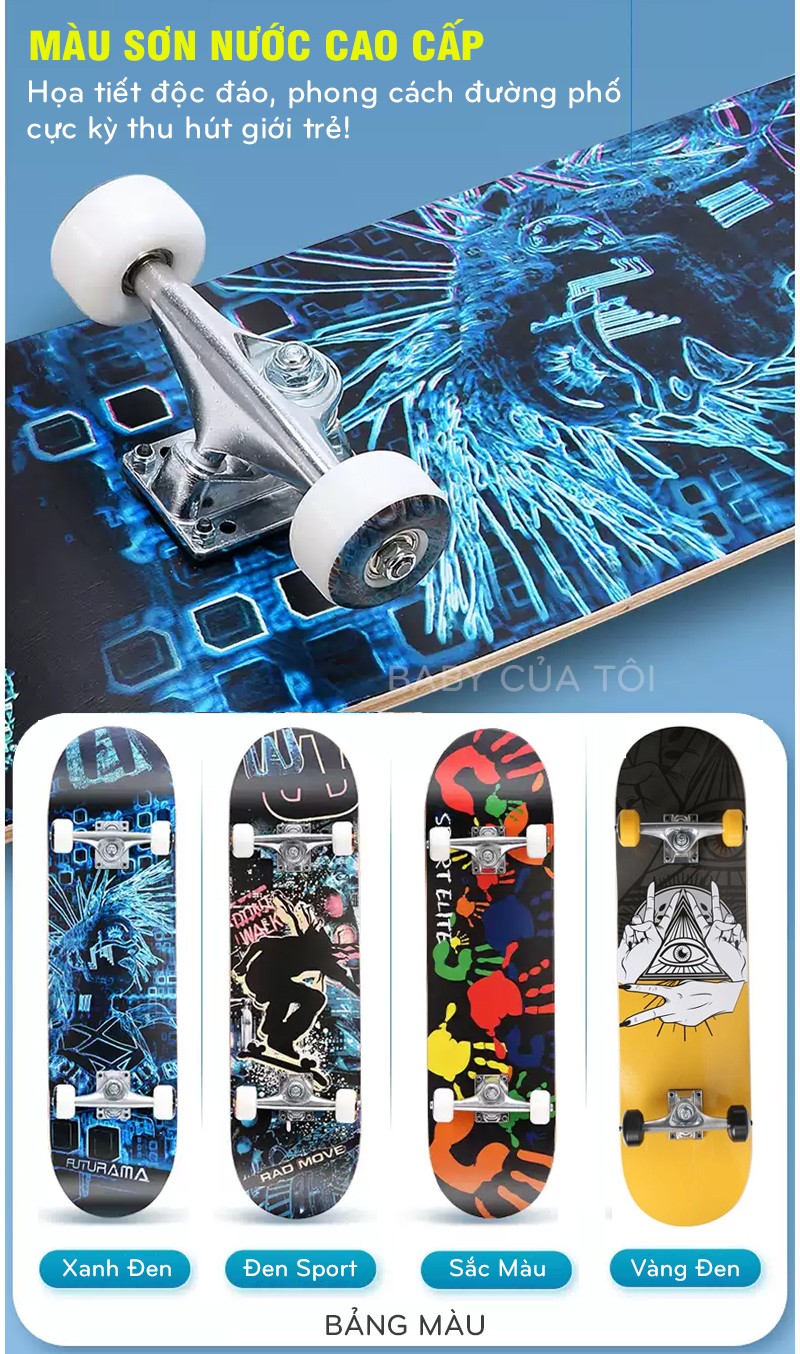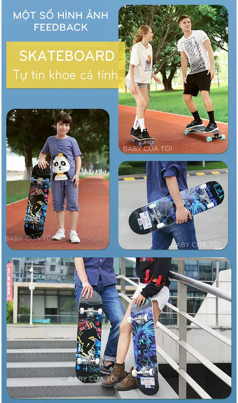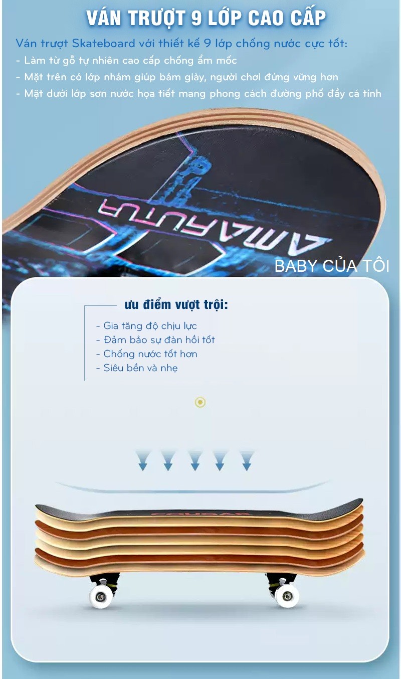 - Chất liệu: Ván trượt 9 lớp gỗ chống nước cực tốt, mặt trên có lớp nhám giúp bám trượt tốt hơn. Mặt dưới họa tiết sinh động, sơn nước cao cấp