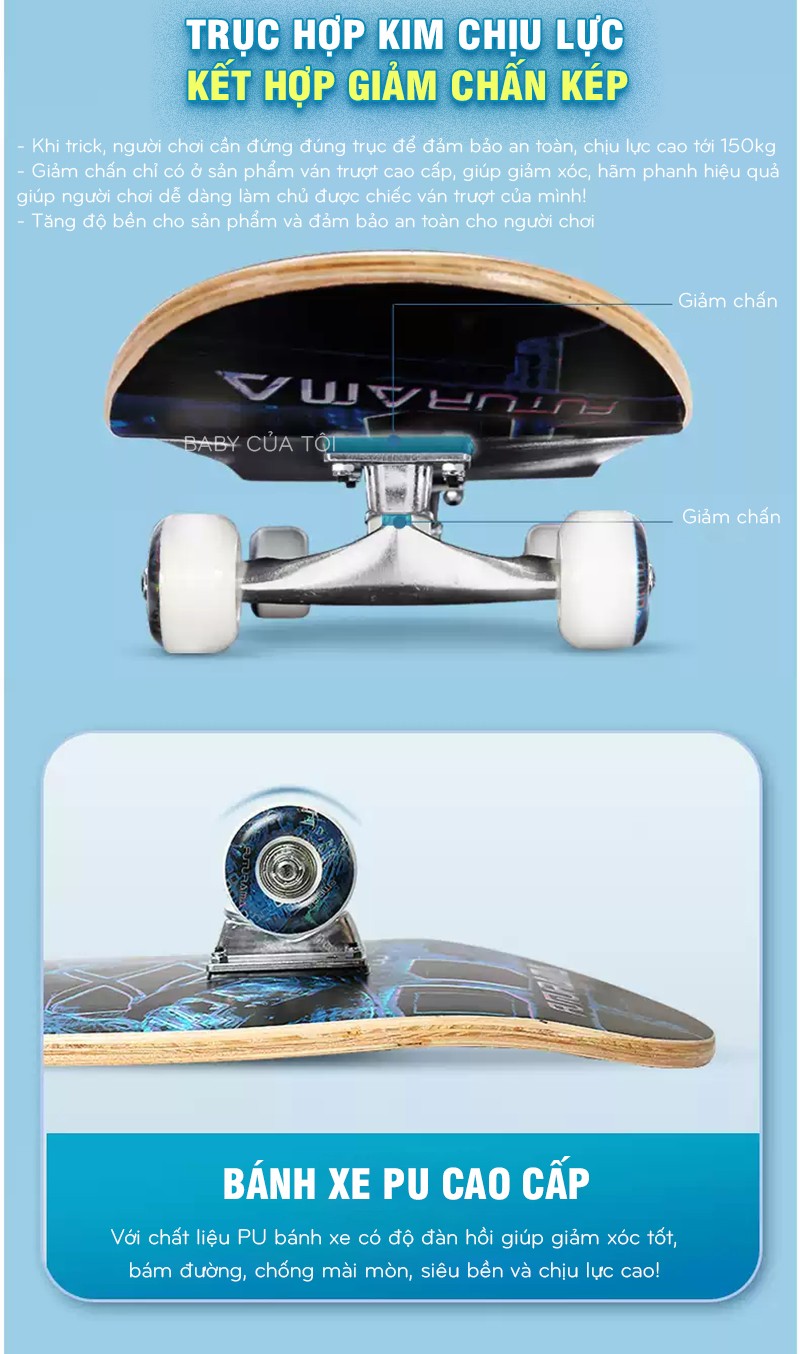 - Đặc biệt: trục làm bằng hợp kim siêu bền, chịu lực kết hợp giảm chấn kép đảm bảo an toàn, hãm phanh tốt giúp người chơi kiểm soát tốc độ (giảm chấn chỉ có ở ván trượt cao cấp, ván trượt chuyên nghiệp)