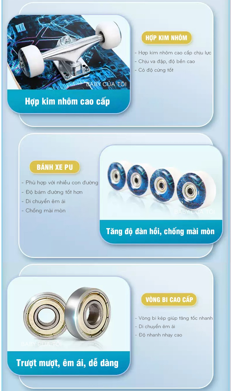 - Vòng bi ABEC 7 carbon di chuyển mượt mà và cực bền, bánh xe PU cực êm, chống mài mòn và bám đường tốt