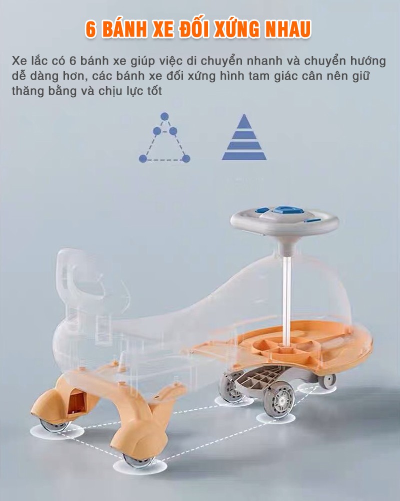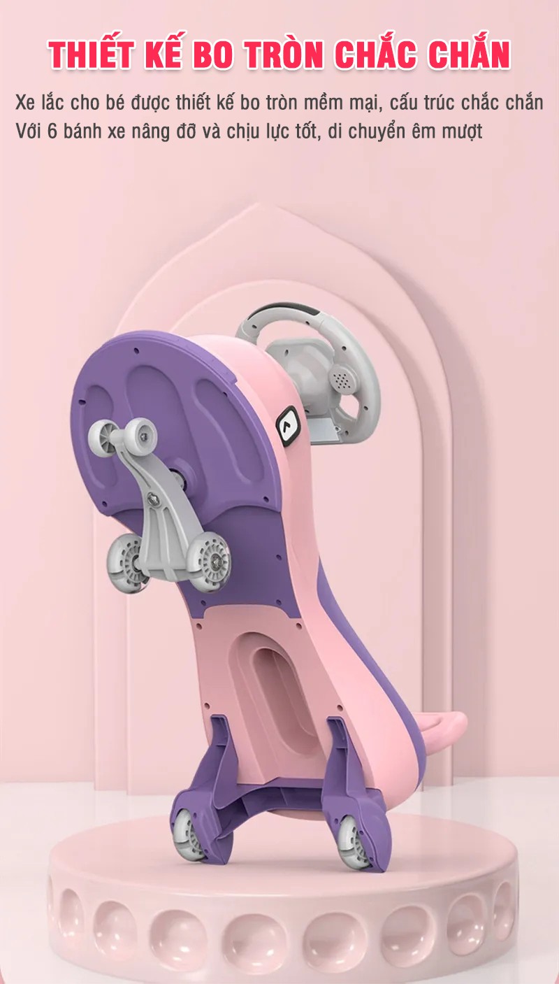 Mình rất ưng ý với chiếc xe lắc này! Thiết kế hình cá đáng yêu, màu sắc bắt mắt. Đặc biệt bánh xe PU di chuyển rất mượt, giảm sốc tốt nên bé chơi rất êm ái. Nhạc vui nhộn, có đèn LED đẹp. Chất lượng tuyệt vời, đáng mua!