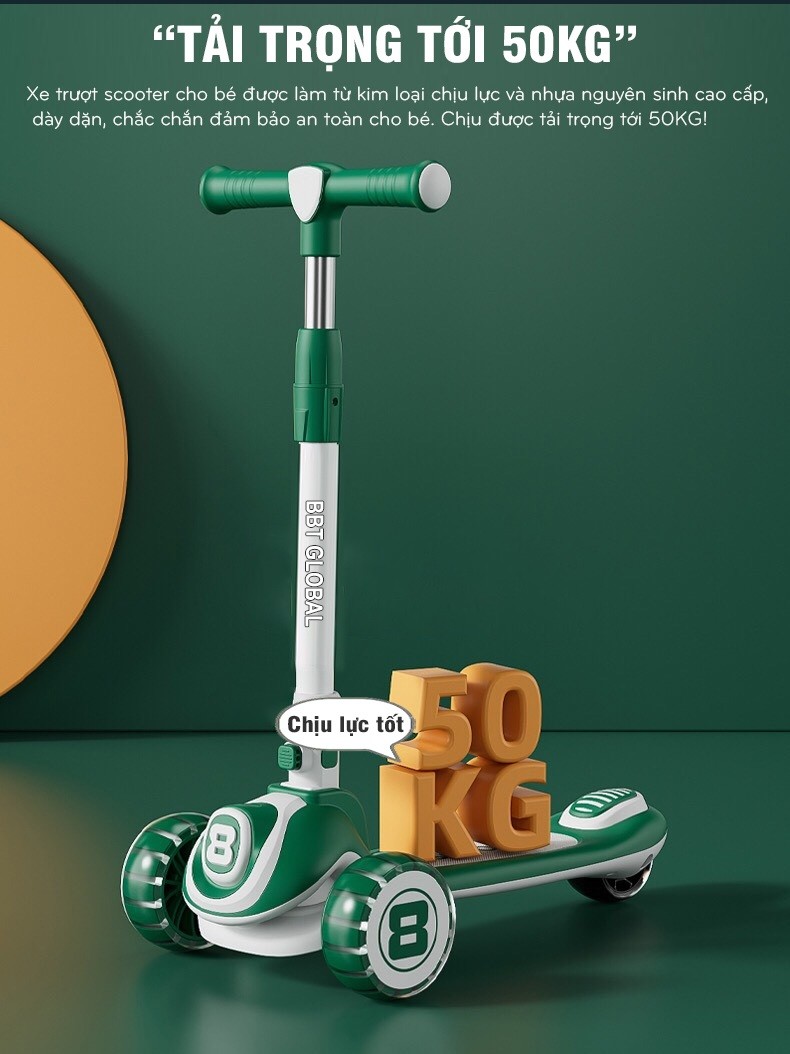- Thương hiệu: BBT GLOBAL - Kích thước: 56*33*60-80cm - Dành cho bé 2-10 tuổi - Tải trọng của xe tới 50kg - Bảo hành 12 tháng - Chất liệu: khung kim loại chịu lực, nhựa nguyên sinh an toàn cho bé - Thiết kế 3 bánh cân xứng, chịu lực tốt và giữ được cân bằng cho xe - Bánh xe PU đàn hồi, chịu lực tốt, có đèn phát sáng khi di chuyển - Hàng nhập khẩu đạt tiêu chuẩn Châu Âu (CE) - Chứng nhận an toàn của Tổng cục Tiêu chuẩn Đo lường Chất lượng (CQ)